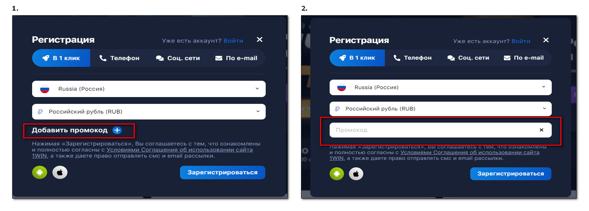 Использовать промокод можно только при регистрации новой учетной записи. Пользователю надо открыть вкладку «Регистрация» и нажать на кнопку «Добавить промокод +». Откроется дополнительное окно, куда и надо ввести символы.
