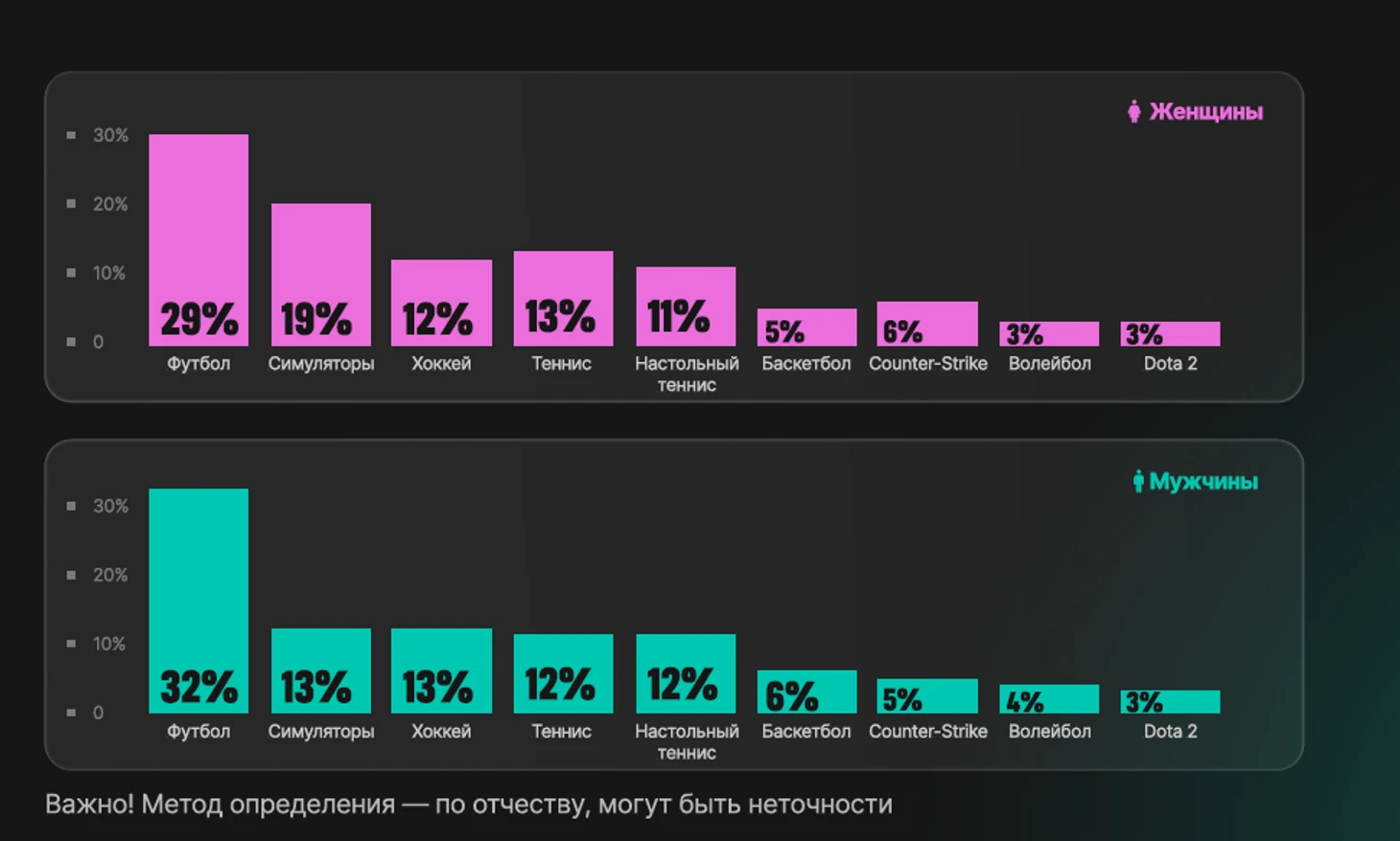 И у мужчин, и у женщин лидером по объему ставок является футбол (32% и 29%). Среди мужской аудитории в топ-3 также входят хоккей и симуляторы (по 13%), у женщин-бетторов – симуляторы (19%) и теннис (13%).