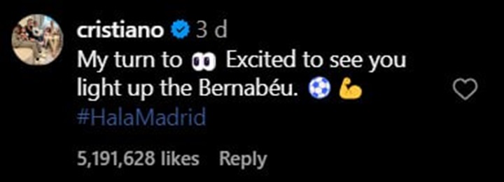 — Моя очередь смотреть. Мне не терпится увидеть, как ты озаряешь «Бернабеу». Этот комментарий стал самым популярным в истории социальных сетей. На утро 7 июня у него уже свыше 5 млн лайков. Он значительно превзошел предыдущее достижение.