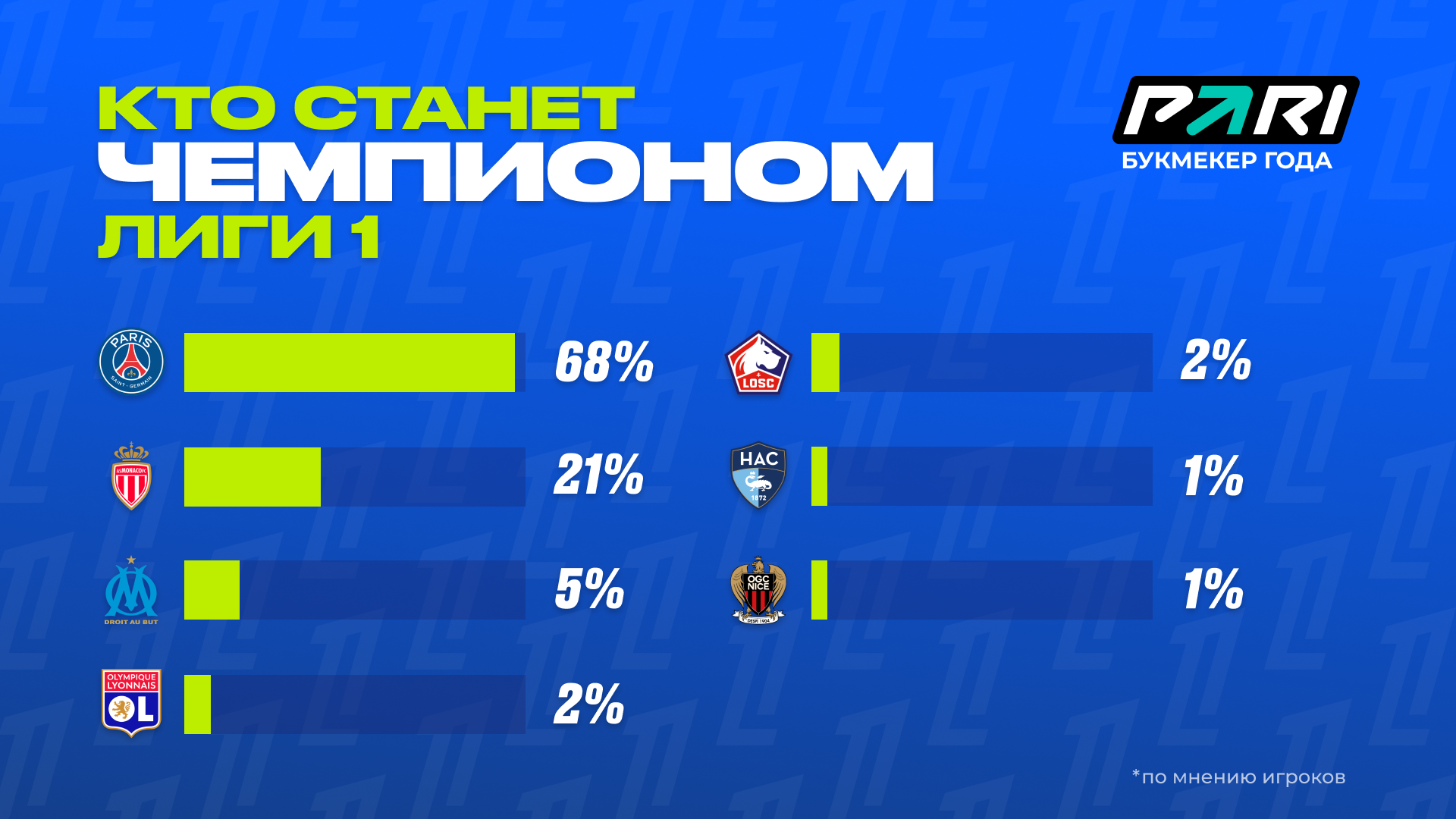 Несмотря на то что игроков раздражает «ПСЖ», именно команду Луиса Энрике они считают главным претендентом на чемпионство. Парижан выбрали 68% опрошенных. 21% респондентов считает, что «Монако» по силам забрать золото. Обе эти команды стартовали с побед: парижане разгромили «Гавр» (4:1), а монегаски оказались сильнее «Сент-Этьена» (1:0).