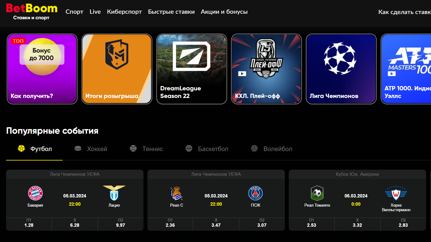 Сайт Бетбум предоставляет доступ к таким разделам: