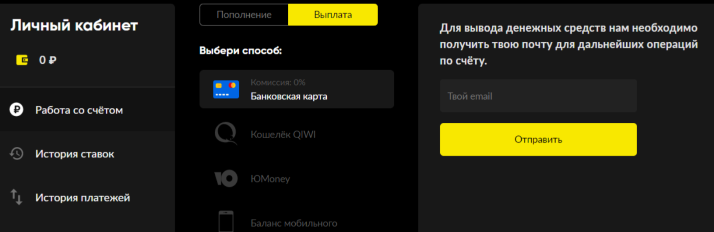 - Платежная система YooMoney и кошелек ЦУПИС. Можно использовать свой кошелек, чтобы сделать депозит или вывести выигрыш. Но максимальная сумма пополнения через YooMoney или кошелек ЦУПИС равна всего 15 000 рублей.