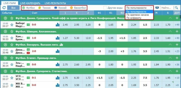 Основные и наиболее популярные среди пользователей категории очевидны. Это российский и международный футбол, теннисные «мэйджоры», кубки Дэвиса, итоговые турниры WTA и ATP, игры НБА, НХЛ, КХЛ, баскетбольной и хоккейной Евролиг, Формула-1, супермногодневки в велоспорте, снукерные турниры, MLB, NFL, NASCAR, гран-при по шоссейно-кольцевым мотогонкам, челленджеры в настольном теннисе и крупные соревнования по киберспорту.