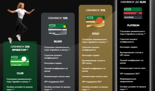 - Club – предоставляется, если общая сумма заключенных пари превышает 1 млн. рублей. Этот статус подразумевает особые условия выкупа пари, начисление кэшбека в размере 7,5%.