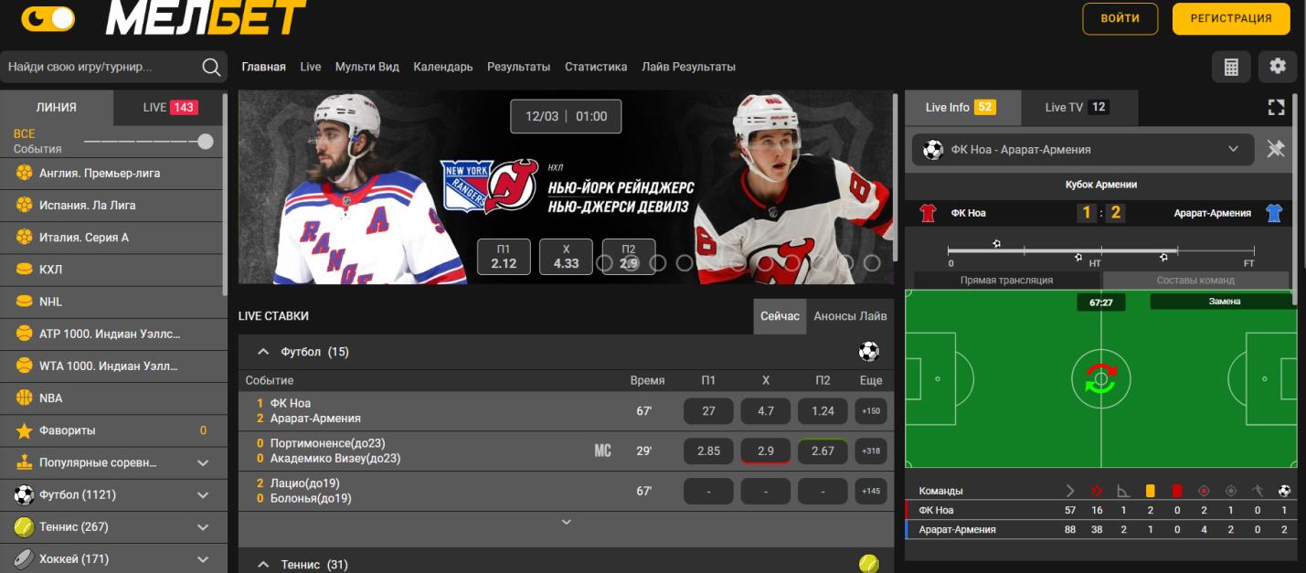 - Live – у клиентов Melbet есть возможность делать ставки в реальном времени. При этом можно следить за матча по видеотрансляции или с помощью с графического матч-центра.