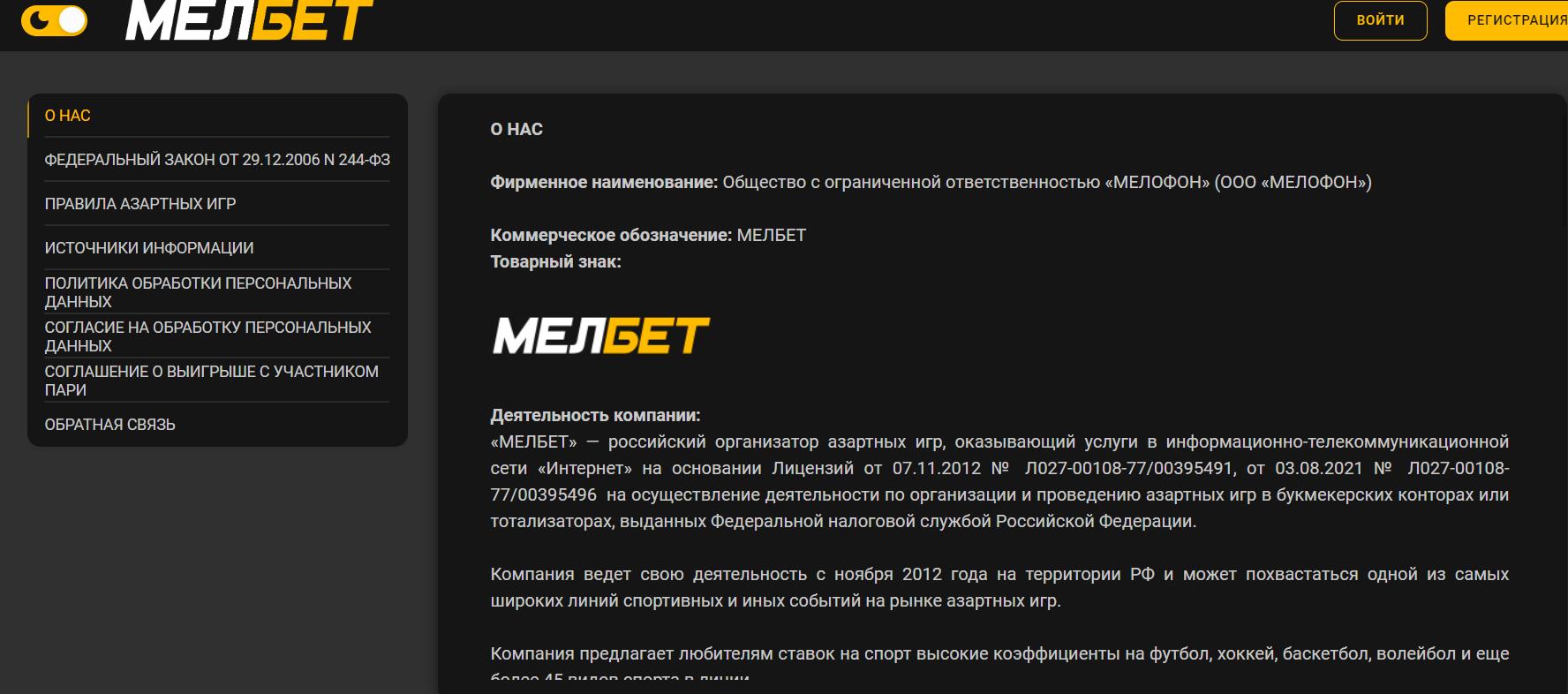 Букмекерская контора Мелбет открылась в России в 2012 году. Она привлекает игроков не только широким спектром предложений, но и высоким уровнем сервиса. Работая на основании лицензии ФНС России, Мелбет подтверждает свою надежность. Эта букмекерская компания подключена к ЕЦУПИС, что позволяет обеспечить дополнительную защиту интересов игроков и соблюдение действующего законодательства России.
