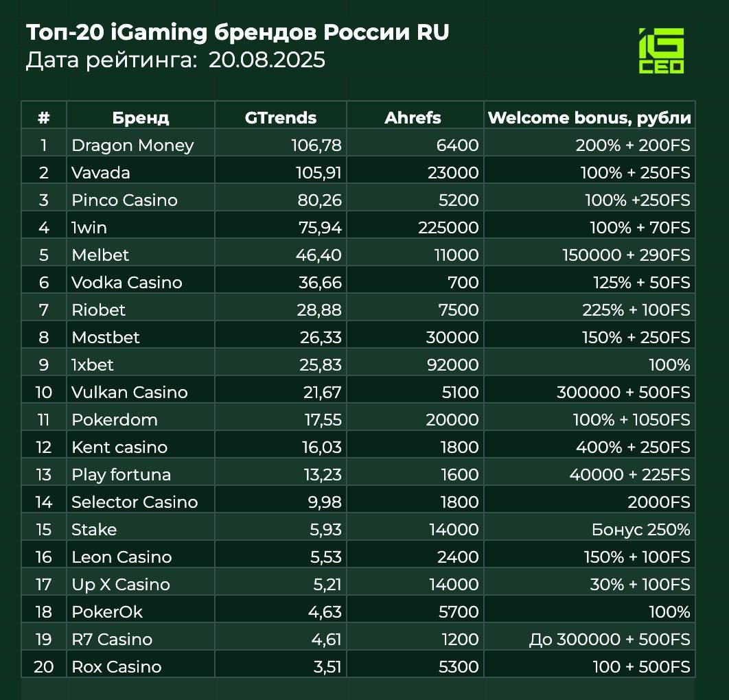 Рейтинг лидеров iGaming в России, июль–август 2025